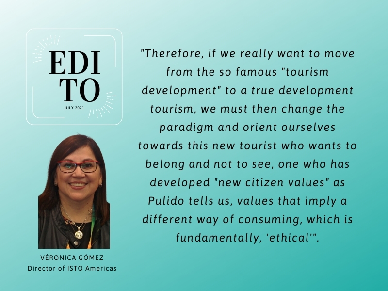 Much has been said during this International Week, and much material to rescue without a doubt, but in this line of thought, I would like to highlight some aspects that Juan Ignacio Pulido, Professor of Applied Economics at the University of Jaén, shared with us during his conference. He told us that we must understand that what we finally "sell" in tourism is the "right to the future satisfaction of an illusion", therefore, it is necessary that we generate those transforming experiences, which entail personal development and involve the greatest social interaction, aspects totally aligned with our Montreal Declaration Towards a humanist, social vision of tourism (1996). Therefore, if we really want to move from the so famous "tourism development" to a true development tourism, we must then change the paradigm and orient ourselves towards this new tourist who wants to belong and not to see, one who has developed "new citizen values" as Pulido tells us, values that imply a different way of consuming, which is fundamentally, "ethical".