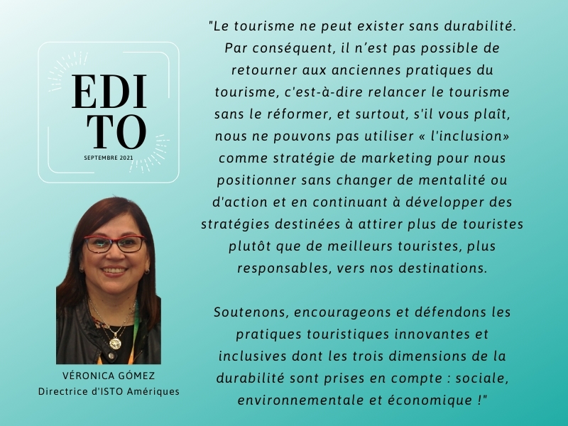 Le tourisme ne peut exister sans durabilité. Par conséquent, il n’est pas possible de retourner aux anciennes pratiques du tourisme, c'est-à-dire relancer le tourisme sans le réformer, et surtout, s'il vous plaît, nous ne pouvons pas utiliser « l'inclusion» comme stratégie de marketing pour nous positionner sans changer de mentalité ou d'action et en continuant à développer des stratégies destinées à attirer plus de touristes plutôt que de meilleurs touristes, plus responsables, vers nos destinations.