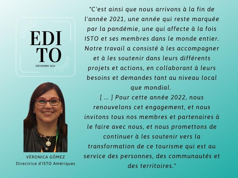 C'est ainsi que nous arrivons à la fin de l'année 2021, une année qui reste marquée par la pandémie, une qui affecte à la fois ISTO et ses membres dans le monde entier. Notre travail a consisté à les accompagner et à les soutenir dans leurs différents projets et actions, en collaborant à leurs besoins et demandes tant au niveau local que mondial. En ce sens, nos présidents de sections régionales, Joel Capo-Chichi pour ISTO Afrique, Sergio Rodriguez pour ISTO Amériques et Muriel Antoniotti pour ISTO Europe, en ont été des grands collaborateurs. Nous avons appris et grandi en tant qu'organisation, nous pouvons donc être satisfaits et dire que notre bilan est très positif, basé sur un travail collectif, solidaire et collaboratif, où chacun d'entre nous - Comité exécutif, Conseil d'administration, équipe permanente et stagiaires - et chacun de nos membres a contribué, à sa manière, à construire un avenir meilleur, à travers un nouveau tourisme, un tourisme qui réaffirme son engagement envers les Droits de l'Homme à travers des initiatives touristiques pour tous, solidaires, responsables et durables.